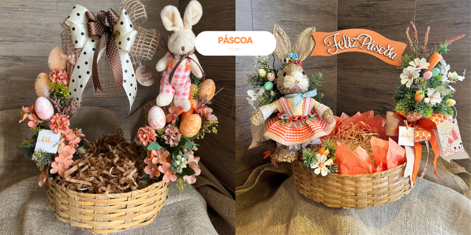 Feitas para abrigar chocolates, flores ou pequenos presentes, elas se tornam um marco memorável da Páscoa. Escolha entre cestas rústicas em tons naturais ou opções mais vibrantes com detalhes em crochê, laços e mini coelhos. Perfeitas para momentos especiais ou para tornar seu presente ainda mais inesquecível.